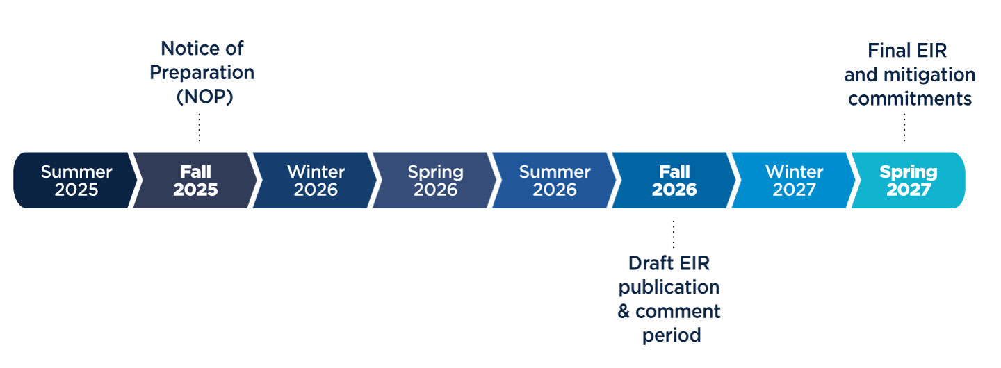 The schedule of documents includes the Notice of Preparation (NOP) in Fall 2025, the Draft EIR publication and comment period in Fall 2026, and the Final EIR with mitigation commitments in Spring 2027.